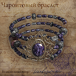 Чароитовый браслет изготавливают в форме змеи, свившейся в кольца вокруг руки. Материалом для него, помимо собственно чароита, как правило, служит бериллиевая бронза или сплав золота и серебра из которых выполняется основа браслета (нити).